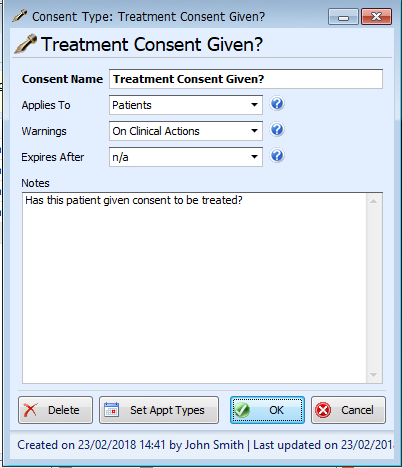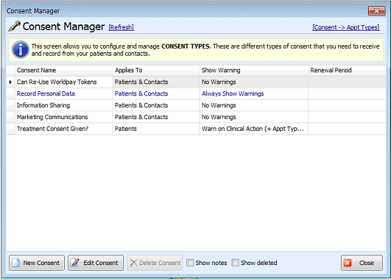 You will then notice a list of predefined consent types. From here you can create new consent types, assign certain consent types to specific appointment types (some treatments may require different consent types) using the link on the top right. You can edit a consent type by left clicking on one and click the Edit Consent button. This brings you to the following screen: