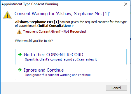 Once done, below is an example of how they would function upon trying to book an appointment for a patient that has not given consent for treatment: