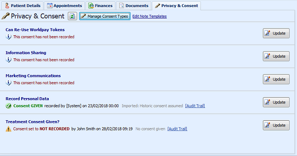 ** Anytime consent is given/updated, ClinicOffice requires notes to help keep track of any changes. This is in line with GDPR requirements on recording how consent was taken. An audit trail is also kept for each consent.**