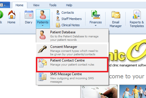 In the update, the contact centre has been moved to the patient drop-down menu: