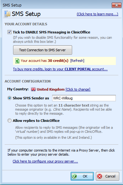 The option to ENABLE SMS messaging needs to be ticked, then it’s always a good idea to press the Test Connection button. You can then use our Client Portal link to purchase credits. If you don’t know your customer details, then you can contact us for them.