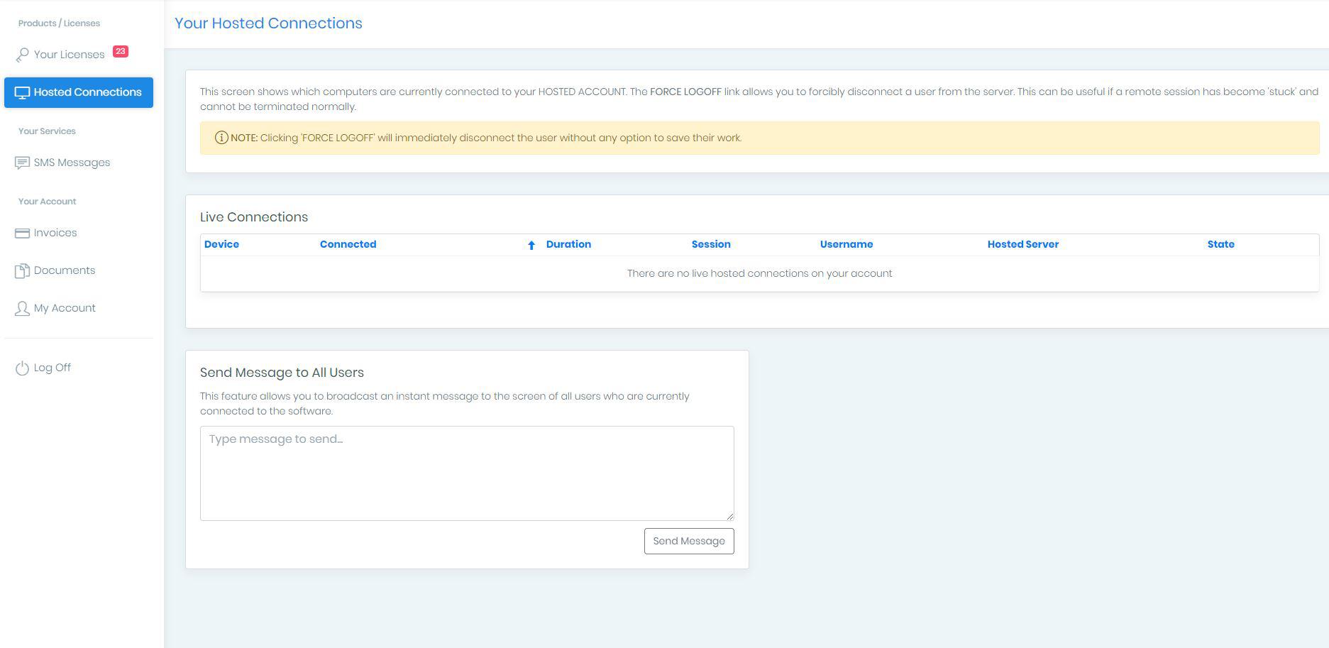 You can use this screen to view current active hosted connections, and if there is a live one, a red force log-off button will become visible.