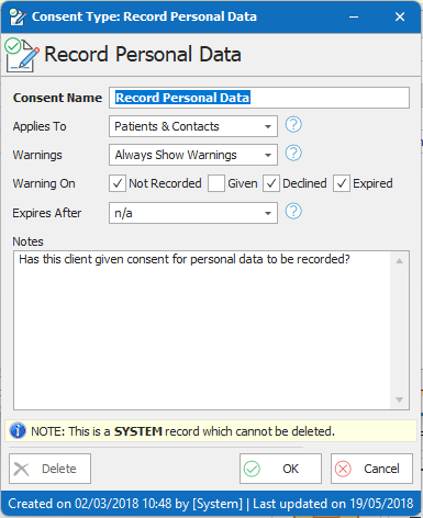 ** Anytime consent is given/updated, ClinicOffice requires notes to help keep track of any changes. This is in line with GDPR requirements on recording how consent was taken. An audit trail is also kept for each consent.**