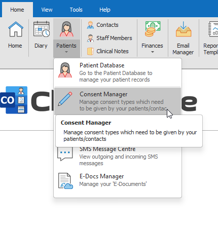 - Under the Patients button drop-down menu, open the Consent Manager