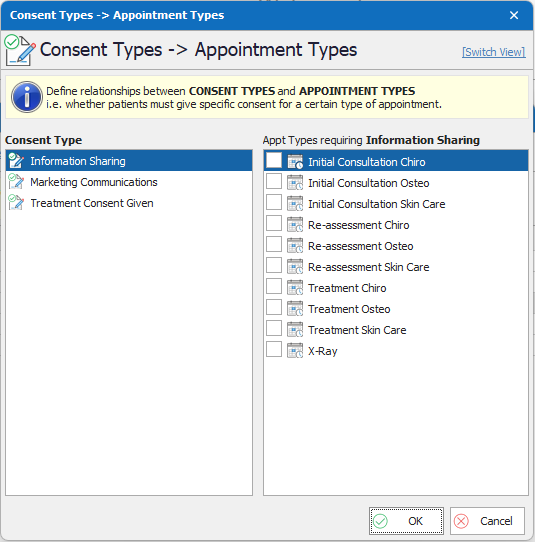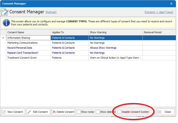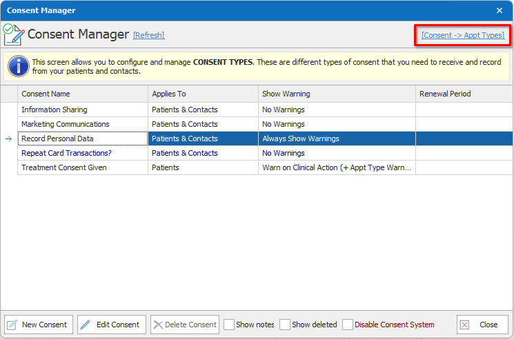 - On the top right of the Consent Manager window, there is a blue link labelled ‘Consent ->Appt Types’. Click here and make sure that none of the appointment types are linked to this consent type.
