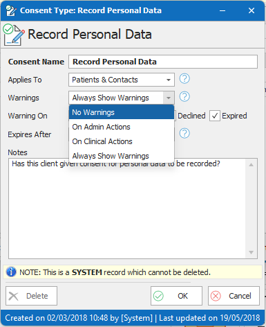 - Manually open the consent type by double-clicking, and set the warning status to No Warnings