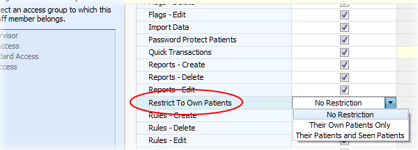Under the “Other Options” section, notice the access right called “Restrict to Own Patients“. This has three settings as shown below :-