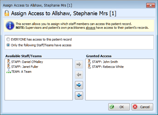 Clicking this button will invoke the “Assign Access” screen which allows you to select which staff members (or TEAMS) are allowed access to this patient record.